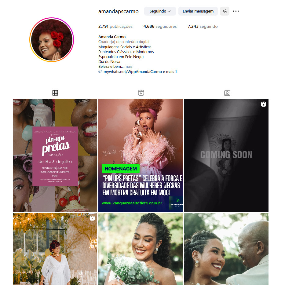 Amanda Carmo é especialista em beleza com foco em pele preta, formada em massoterapia, estética e maquiagem profissional e cênica. Atua há mais de 15 anos na área da beleza, onde já assinou a produção de noivas, debutantes, madrinhas, campanhas publicitárias, editoriais de moda, além de ter participado de grandes eventos como o São Paulo Fashion Week.